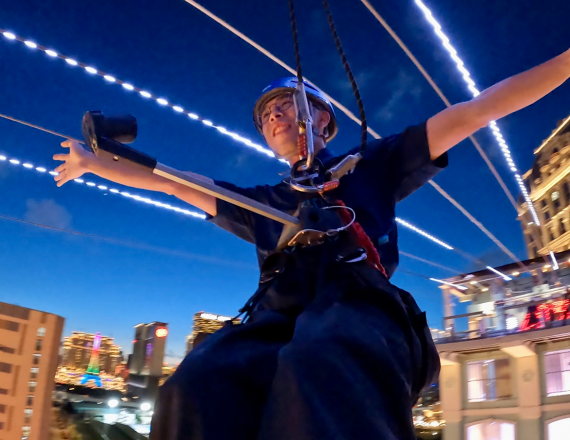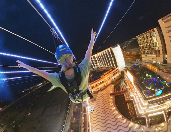ZIPCITY riders can choose to fly either during the day or at night. In the day, enjoying panoramic views of Lisboeta Macau and neighbouring Cotai properties. At night, a spectacular audio-visual show awaits.